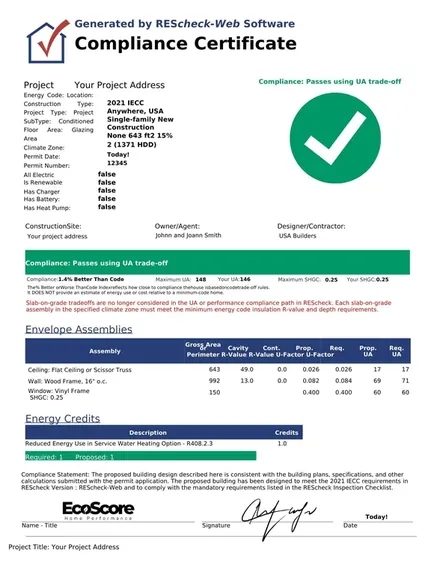 A REScheck report is the U.S. Department of Energy's official residential energy compliance document. It uses the REScheck software to perform a UA (thermal transmittance × area) calculation that proves your building's thermal envelope meets the minimum energy efficiency requirements of the International Energy Conservation Code (IECC).